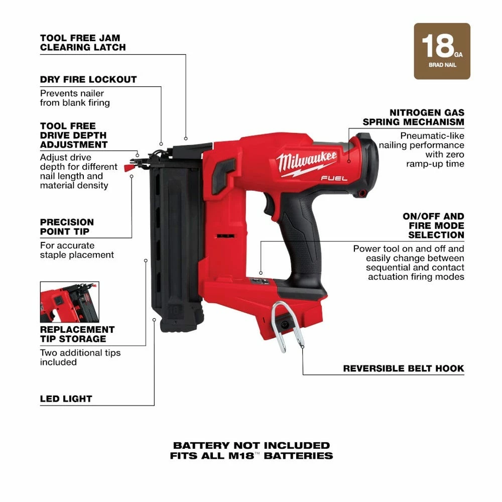 Our M18 FUEL™ 18ga Brad Nailer delivers peak productivity at your jobsite, providing you with unmatched nailing performance without the hassle of a compressor and hose. Leveraging our nitrogen air spring mechanism, the Brad nailer allows you to consistently sink nails to the proper depth in hard and soft woods while leaving clean nail holes matching the head of the nail. The combination of our POWERSTATE™ Brushless Motor and REDLINK PLUS™ Intelligence delivers you with unmatched fire rate with zero ramp-up time keeping you efficient throughout your day. Additionally, the cordless brad nailer operates using our REDLITHIUM™ Batteries (not included) and sealed compressed nitrogen to drive each nail, completely eliminating the cost of gas cartridges and maintenance associated with competitors’ nailers. The 18 gauge nailer is compact in size, and very lightweight, providing you with unmatched access into tight spaces and limiting your fatigue throughout your day. The M18 FUEL™ 18ga Brad nailer delivers the pneumatic performance that professional carpenters and remodelers expect with the freedom and convenience of cordless.