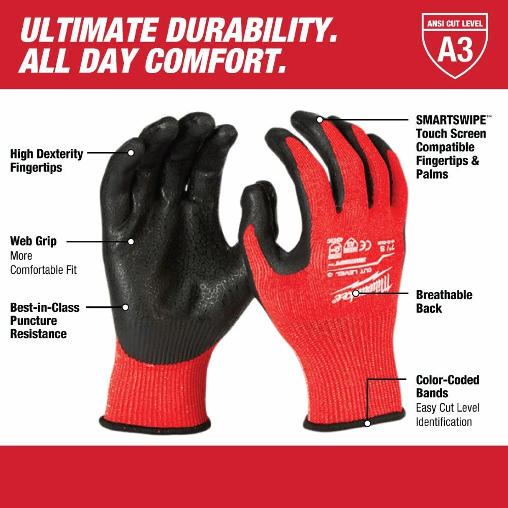 Milwaukee Tool’s cut resistant dipped gloves are designed to provide ultimate durability, all–day comfort, and best in class dexterity for handling small objects. These gloves feature ANSI and EN cut level III protection as well as best in class puncture resistance to help prevent injuries from sharp objects on the jobsite. Additionally, Milwaukee cut resistant gloves utilize a Comfort Web Grip to provide all-day comfort, best in class grip performance, and ultimate durability. SMARTSWIPE™ fingertips & palms provide full access to touchscreen devices without removing the gloves and also feature high dexterity fingertips to maximize control when handling small objects.