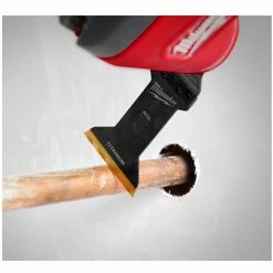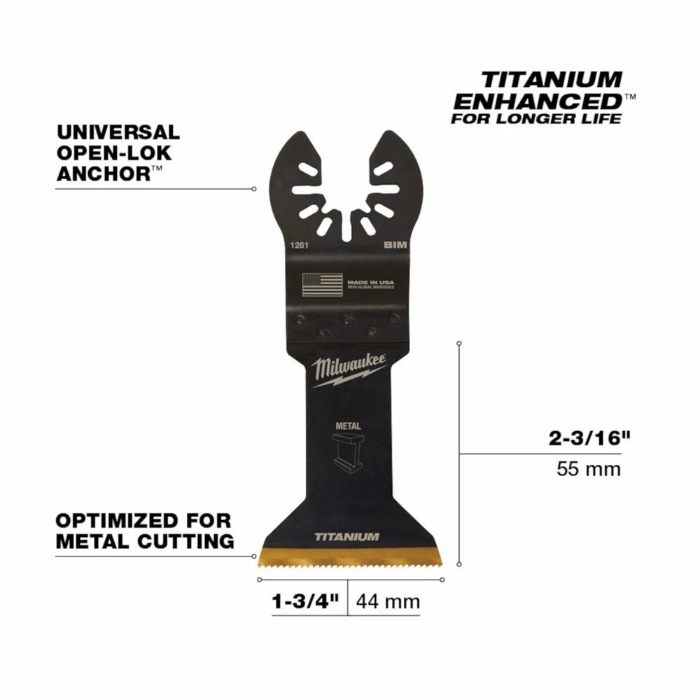 The MILWAUKEE® Universal Fit OPEN-LOK™ 1-3/4″ Titanium Enhanced Bi-Metal Blade 3 Pack is designed for Oscillating Multi-Tools. These multi-tool blades for metal are titanium enhanced and made from premium high-speed steel. The 1-3/4″ bi-metal blade has a slightly narrower cutting width than most standard bi-metal blades and a slightly longer blade body, designed for cutting soft metals, wood, nails, PVC, and drywall. It uses a combination of tooth form and material to offer better cutting performance in soft metals. These bi-metal multi-tool blades are designed and made in the USA with global materials.