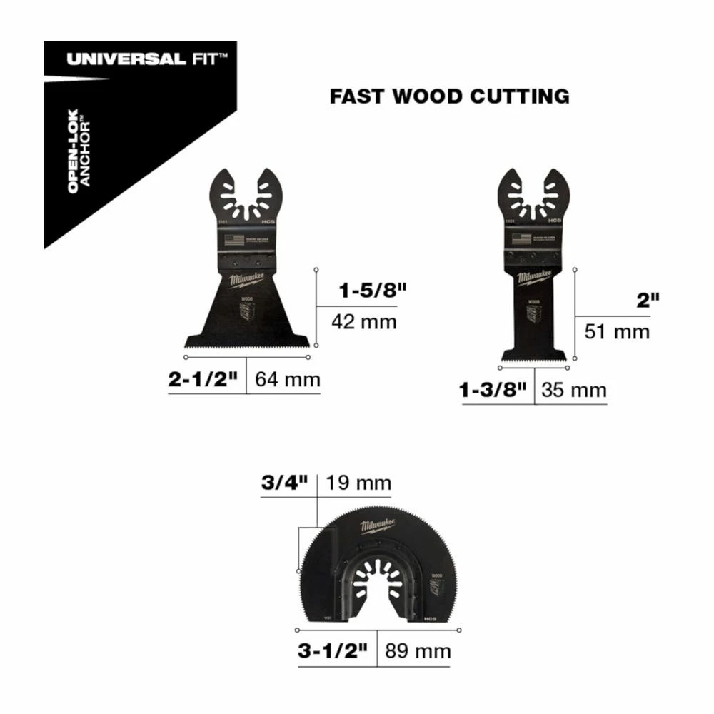 The MILWAUKEE® Universal Fit OPEN-LOK™ 3-Piece Wood Cutting Oscillating Multi-Tool Variety Pack features an assortment of the next generation oscillating blades for optimal cutting performance in wood, PVC, drywall, and other soft materials. The oscillating wood blades are designed with aggressive, precision ground teeth for fast cuts in wood, drywall, and PVC. A 1-3/8″” end-cut blade, a 2-1/2″” end-cut blade, and 3-1/2″” segmented blade offer versatile cutting to ensure the right blade for the right cut. This oscillating tool blade variety pack is designed and made in the USA with global materials.