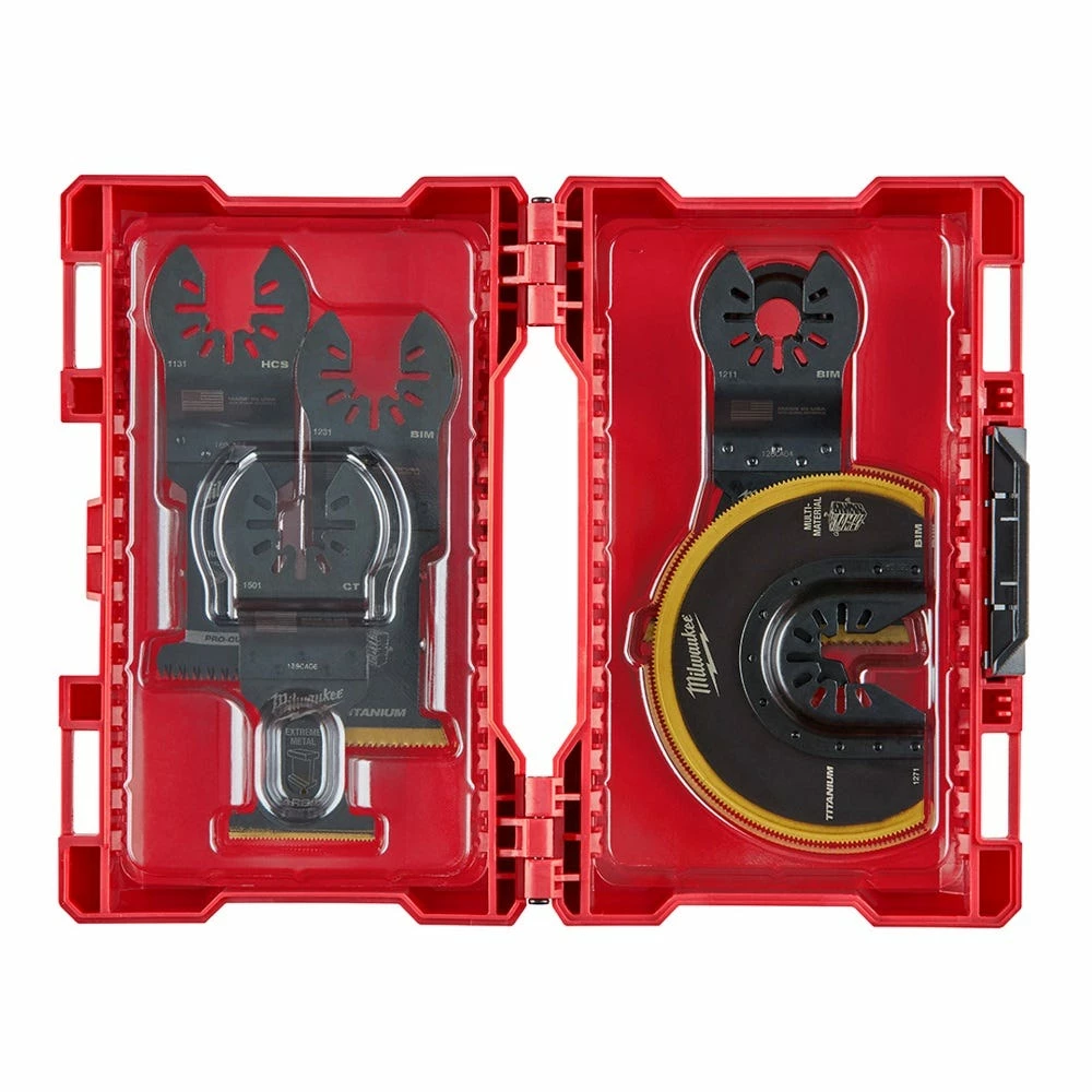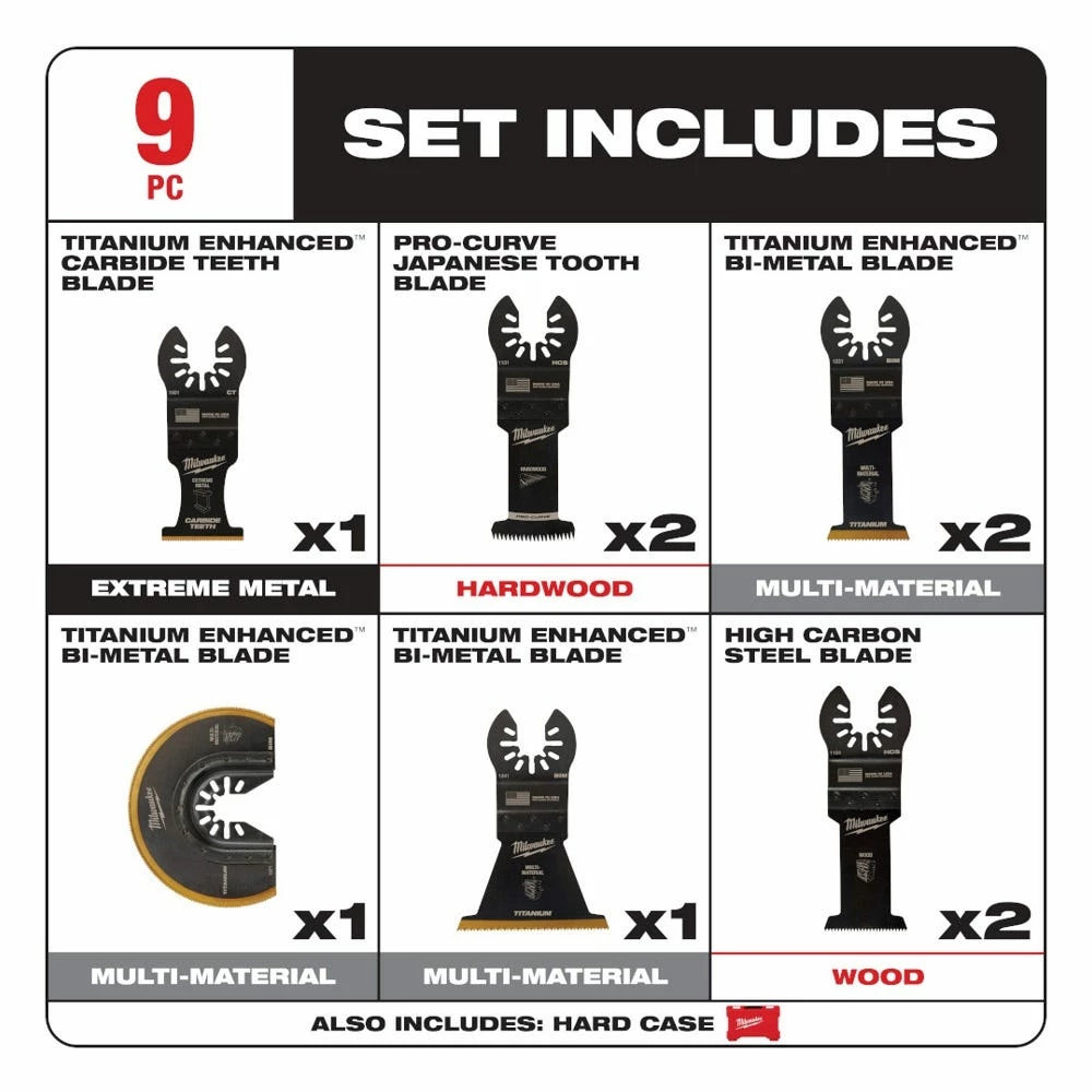 The MILWAUKEE® Universal Fit OPEN-LOK™ 9-Piece Oscillating Multi-Tool General Purpose Variety Pack offers a versatile assortment of top-performing oscillating blades. The included Titanium Enhanced Carbide Teeth Blade is designed to last up to 50X longer in extreme metals compared to standard bi-metal blades. The Carbide Teeth are ideal for cutting screws, bolts, metal pipe, nails, and more. The Titanium Enhanced Bi-Metal Blade uses premium high-speed steel and lasts up to 15X longer than standard high carbon steel (HCS) blades. The bi-metal blade is ideal for smooth cuts in wood & nails, PVC, and drywall. The segmented blade is great at maintaining a long straight cut, cutting up to corners, and flush cutting. The Triple Ground Japanese Tooth Blade delivers up to 2X faster cuts than the previous Milwaukee HCS blade and features a PRO-CURVE™ cutting edge for greater control. Ideal for fast, clean cuts in hardwood and can also be used in other woods, PVC, and drywall. The oscillating wood blades have been designed with aggressive, precision ground teeth for fast cuts in wood, drywall, and PVC. This oscillating tool blade variety pack is designed and made in the USA with global materials and includes a storage case.