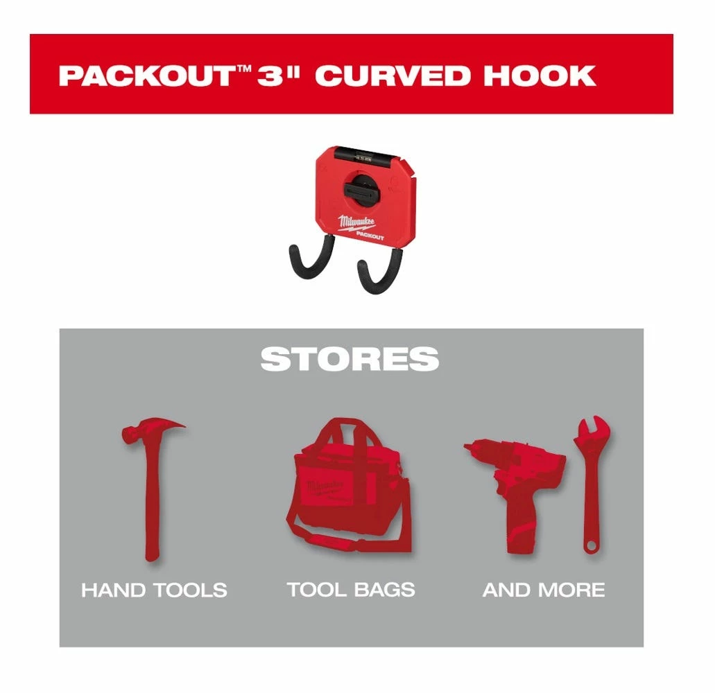 Our PACKOUTâ„¢ 3″ Curved Hook delivers the most secure mounting when paired with PACKOUTâ„¢ Wall Plates, strongly holding the PACKOUTâ„¢ solution mounted to the wall. This hook is constructed with metal reinforcement to maintain shape when loaded and is optimized to store hand tools, tool bags, and more. To keep your tools securely in place and protected, our hook features protective rubber grips. Additionally, the hook features connectivity with PACKOUTâ„¢ solutions allowing you to fully customize your shop, MILWAUKEE® PACKOUTâ„¢ is the industry’s most versatile and durable modular storage system.