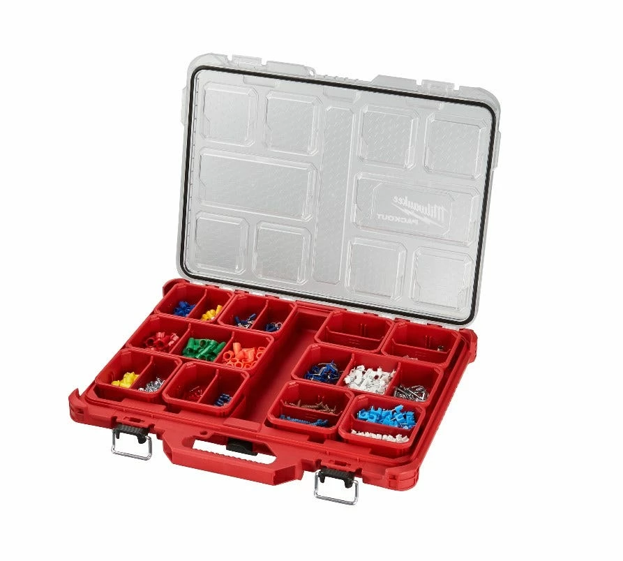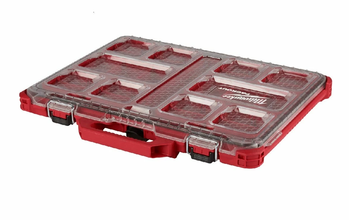 The PACKOUT modular storage system is the industry’s most durable and versatile storage system. The PACKOUT low-profile organizer is constructed with impact resistant materials so it can withstand harsh jobsite environments. An IP65 rated weather seal protects your tools, accessories and small parts from rain and other jobsite debris. The shallow organizer’s interior features 10 removable storage bins that are easily mountable on the jobsite for quick access. The transparent lid of the organizer seals the bins to prevent contents from migrating and shifting during transport. Heavy-duty latches and reinforced hinges ensure that the slim organizer keeps the contents contained and protected. The PACKOUT modular storage allows users to customize and build their own storage system to easily transport and organize tools and accessories.