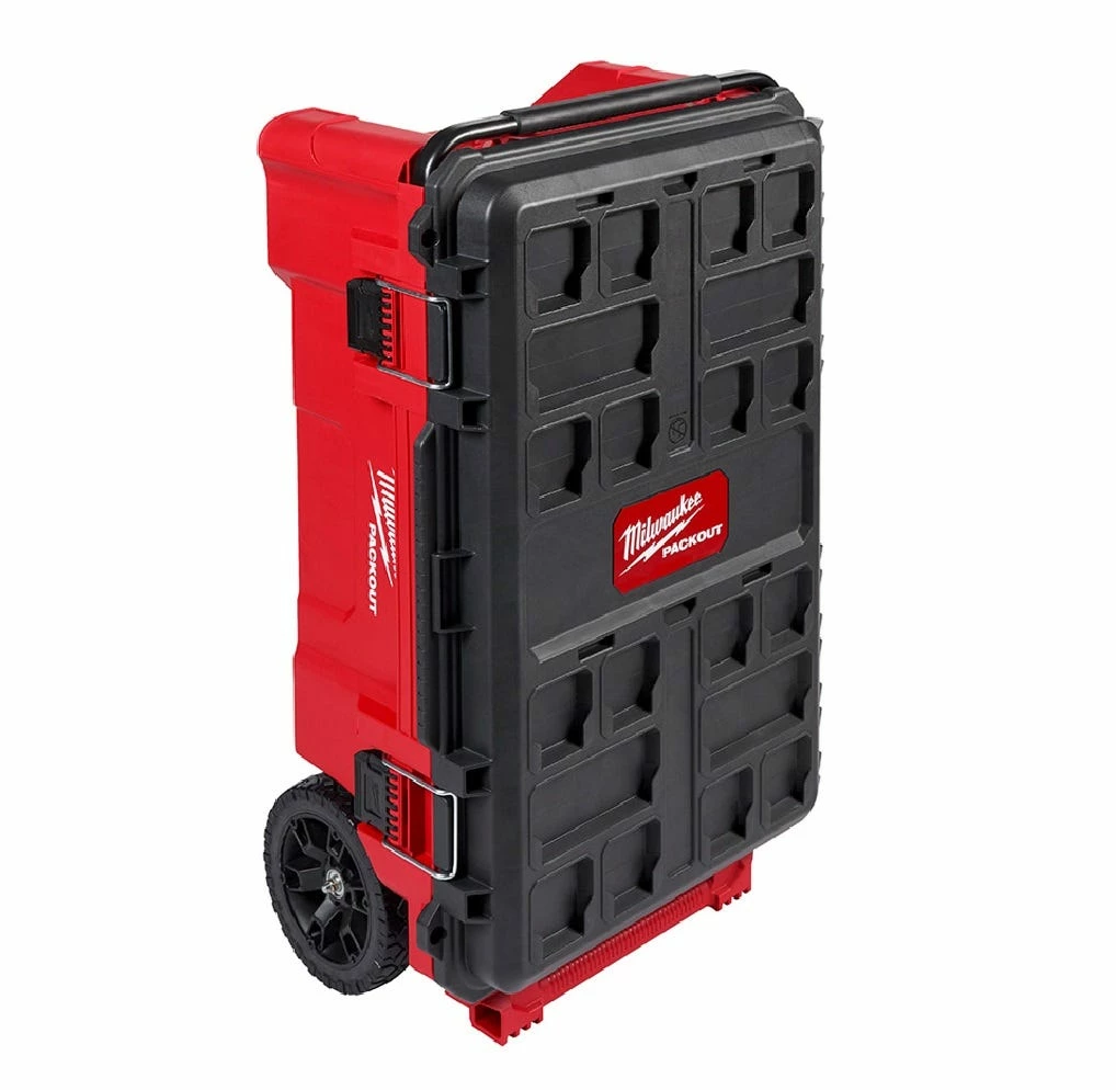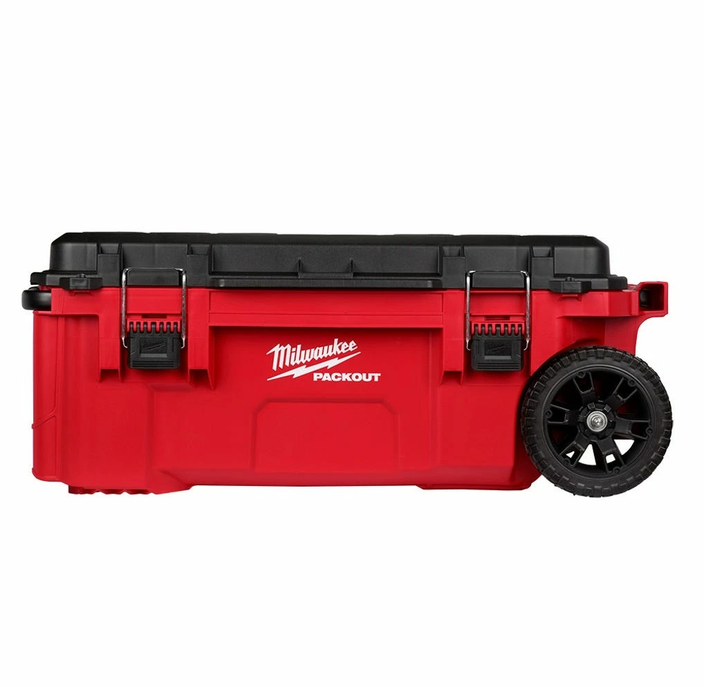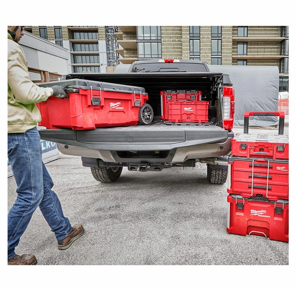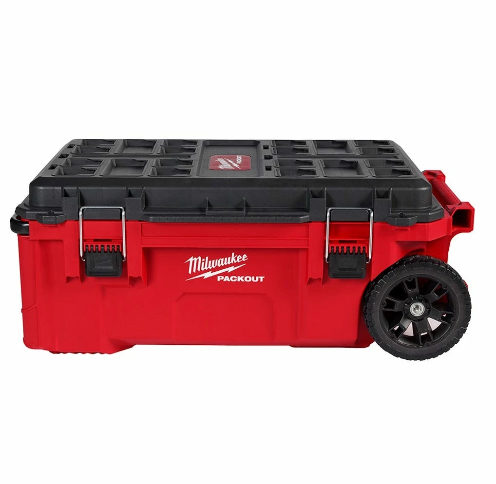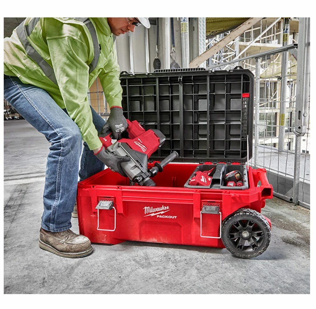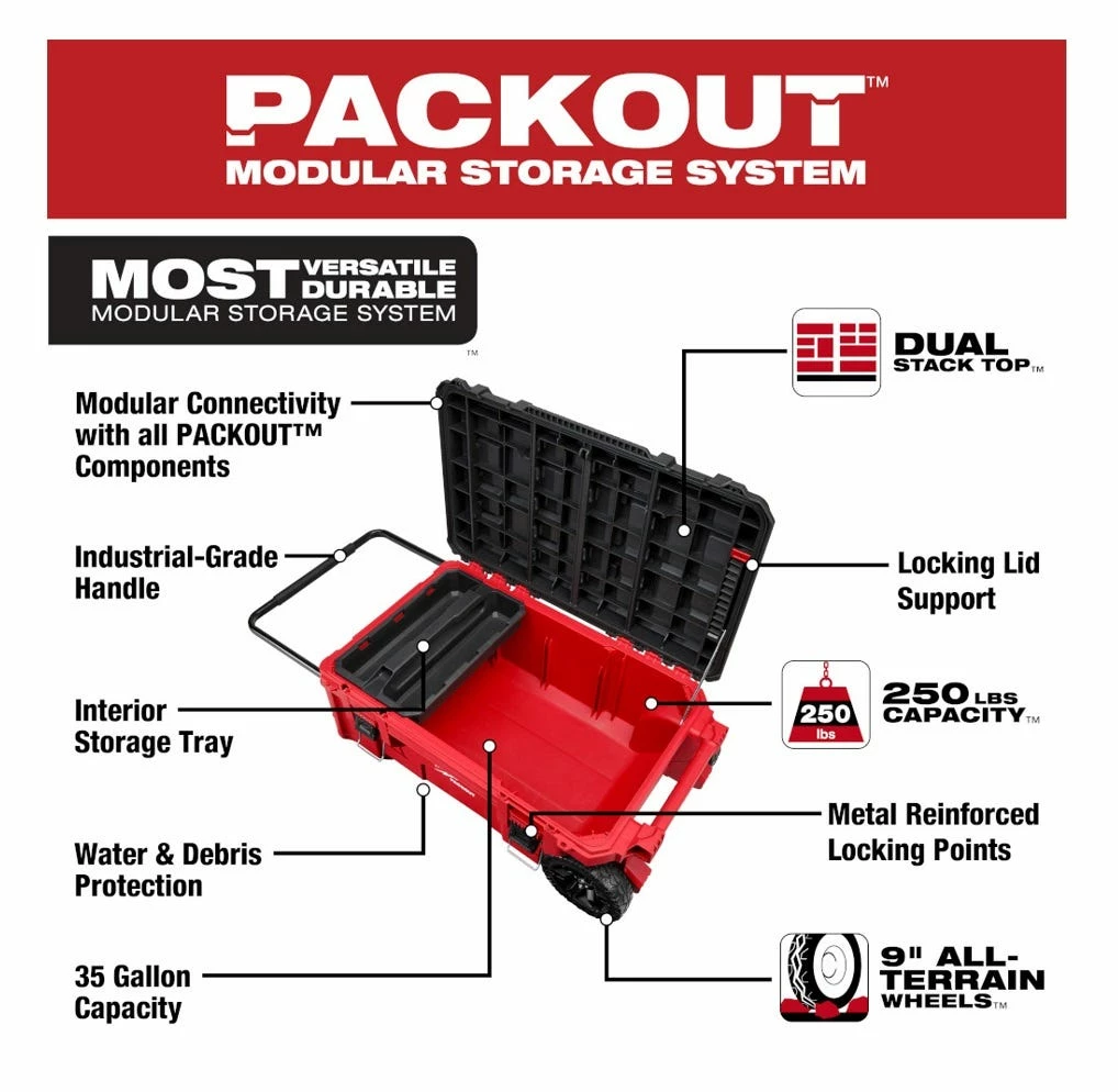 Our PACKOUTâ„¢ Rolling Tool Chest allows you to bring two PACKOUTâ„¢ stacks onto the site with a Dual Stack Top. This large tool chest has a 250lb weight capacity. The tool chest is constructed with impact-resistant polymers and water and debris protection to withstand harsh jobsite conditions. An industrial-grade extension handle and 9″ all terrain wheels ensure this tool chest can be rolled anywhere on the jobsite. With a 35 gallon capacity, and an interior organization tray, this tool chest keeps your equipment organized to fit your needs. The Locking Lid Support feature keeps the top securely open while you access tools and accessories. The PACKOUTâ„¢ modular storage system allows you to customize your storage system to keep tools and accessories organized and easy to transport. MILWAUKEE® PACKOUTâ„¢ is the industry’s most durable and versatile storage system.