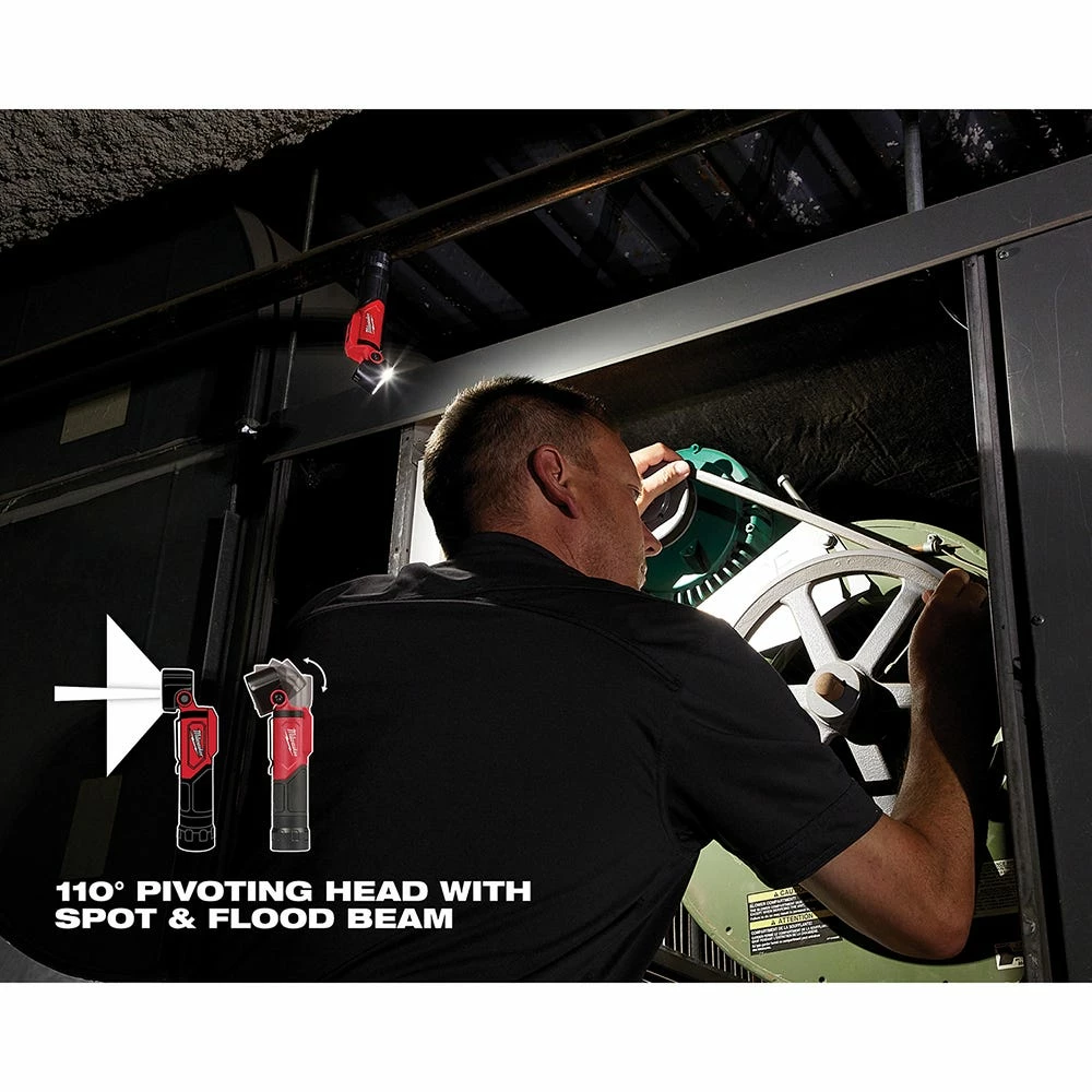 The MILWAUKEE USB Rechargeable Pivoting Flashlight offers high output in any task and any position. It’s powered by REDLITHIUM USB, giving users high output light for any task from any position. The flashlight features spot and flood beam modes allowing users to change it from a high powered flashlight to a versatile task light with the press of a button. With 500 Lumens of TRUEVIEW High Definition Output and a 155 m (377 ft.) spot beam distance, it gives users the ability to search, trace, or inspect better from farther away. In flood mode, the LED flashlight’s 110 degree pivoting light head and magnet base provides users with hands-free task light, while directing the light exactly where they need it. Maximize brightness or extend runtime with high and low flood mode options with up to 12 hours of runtime. Turn the flashlight into a right angle light with a built-in pocket clip designed for chest pockets and straps. The pivoting head LED flashlight is powered by a Milwaukee REDLITHIUM USB 3.0AH Battery, providing all-day runtime, more recharges and a 3X faster charge time. The USB battery can be charged while inside the flashlight via Micro USB or swapped out with another REDLITHIUM USB battery for virtually no downtime. The USB Rechargeable Pivoting Flashlight is great for any trade professional looking for the ultimate versatility in a flashlight and is covered by a limited lifetime warranty.