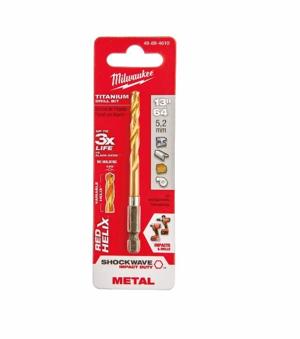 Milwaukee® SHOCKWAVE™ Impact Duty Titanium Drill Bits with RED HELIX™ are engineered for impacts and drills. Designed with a Variable Helix with an aggressive 35° Helix Angle which ends at 15°, the Impact Duty Titanium Drill bits with RED HELIX provide Rapid Chip Removal to limit heat buildup to Stay Sharper Longer. The 135° split point tip delivers a precision start and prevents walking for fast, accurate holes. Titanium coating can be used in all drilling applications to give you up to 3X life vs. Black Oxide Drill Bits.