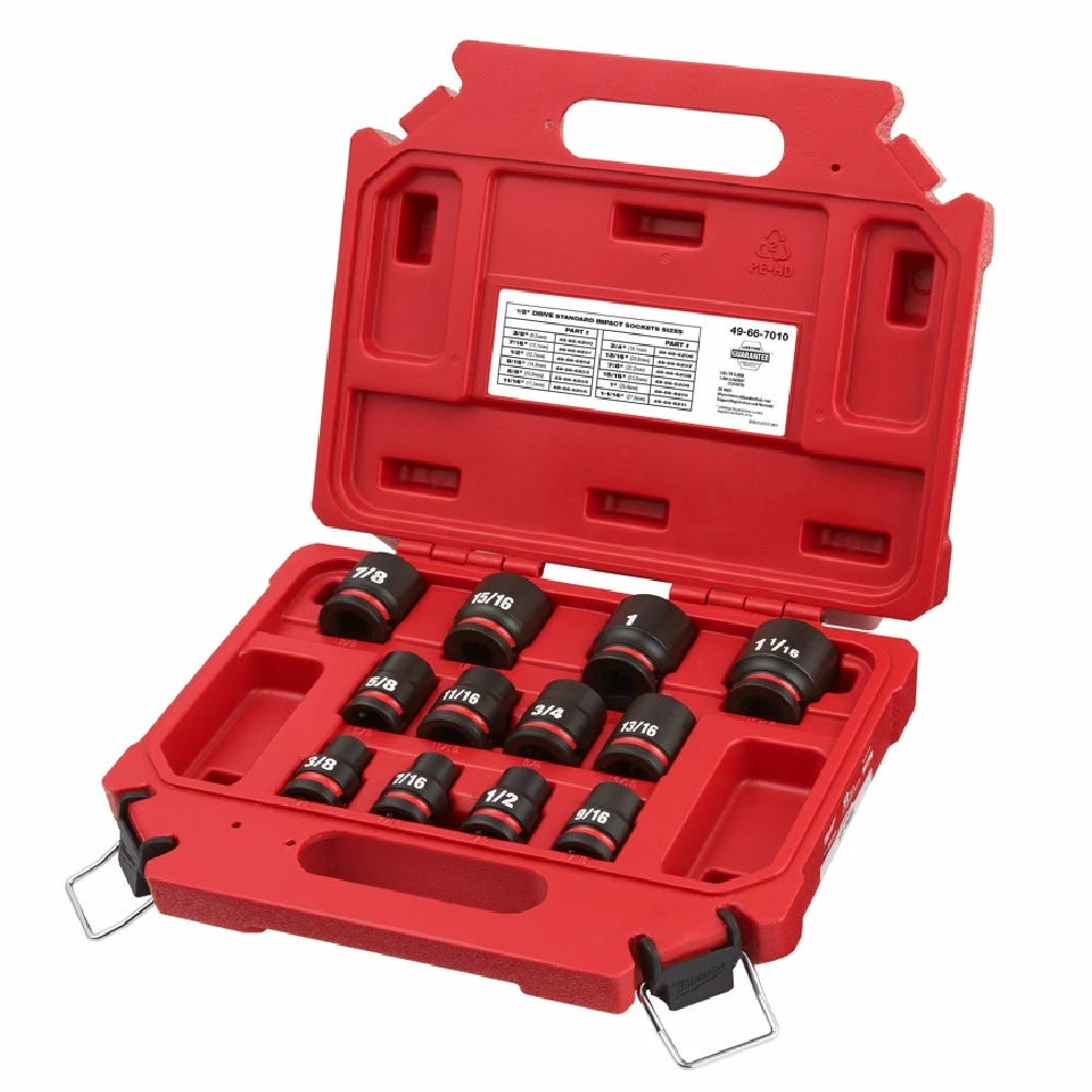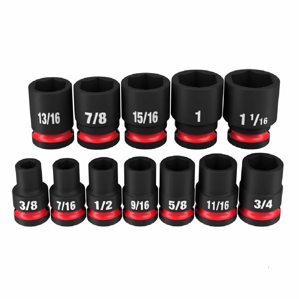 Tackle tough jobs like a pro with this 9-Piece Milwaukee Shockwave Impact Duty 1/2 in. Drive Socket Set. Made from proprietary steel, these impact driver socket adapters are heat-treated to deliver maximum durability and strength. The thin wall construction of the impact socket gives you easy access to tight spaces. These Shockwave socket adapters have 6-point deep wells for superior fastener engagement and are designed for use with impact wrenches in heavy-duty applications.