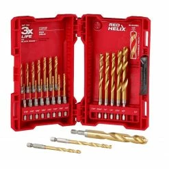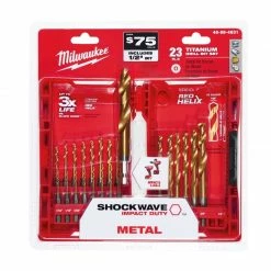 The MILWAUKEE 23 Piece SHOCKWAVE RED HELIX Titanium Drill Bit Set is engineered for extreme durability and long life. The QUAD EDGE tip delivers a precision start and four cutting edges to create smaller chips for faster removal and less heat leading to longer bit life. Designed with a Variable Helix that includes an aggressive 35 degree helical angle, which ends at 15 degree , these tapered drill bits with RED HELIX provide Rapid Chip Removal limiting heat buildup to Stay Sharper Longer. The bits also feature an internal ENHANCED TAPERED WEB that greatly increases their strength, reducing premature breakage. Ideal for various applications including but not limited to wood, plastics, and metals, Milwaukee Red Helix Titanium Drill Bits provide up to 5X life vs. black oxide drill bits.