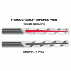 Milwaukee® Thunderbolt® Black Oxide Jobber length drill bits are designed for extreme durability and long life. The Thunderbolt® web features a thicker core than a standard drill bit, which provides ultimate strength and protects against side-load breakage. A specially designed parabolic flute form clears chips and debris fast to keep the bit cool. A precision start, 135 Split Point tip starts on contact to keep the bit from walking for fast accurate holes. Excellent for drilling on curved surfaces, requires less effort to drill and is highly recommended for use with portable drills.