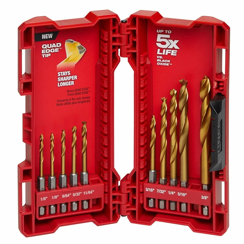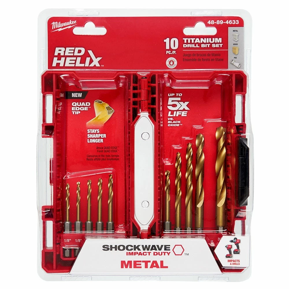 Our SHOCKWAVE™ RED HELIX™ Titanium Drill Bits are engineered for extreme durability and long life. The QUAD EDGE™ tip delivers a precision start and four cutting edges to create smaller chips for faster removal and less heat for longer bit life. The Variable Helix ™ design includes an aggressive 35° helical angle, which ends at 15°, these titanium drill bits with RED HELIX™ provide Rapid Chip Removal™ limiting heat buildup to Stay Sharper Longer™. The bits also feature an internal ENHANCED TAPERED WEB that greatly increases their strength, reducing premature breakage. Our titanium drill bits are ideal for various applications, including but not limited to wood, plastics, and metals. MILWAUKEE® Red Helix Titanium Drill Bits provide up to 5X life vs. black oxide drill bits.