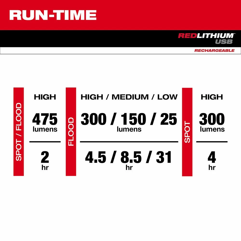 - Spot/Flood Mode: 475 Lumens- 2.25 Hrs. Flood High Mode: 300 Lumens- 5 Hrs. Flood Medium Mode: 150 Lumens- 9 Hrs. Flood Low Mode: 100 Lumens- 33 Hrs. Spot High Mode: 300 Lumens- 4.5 Hrs.