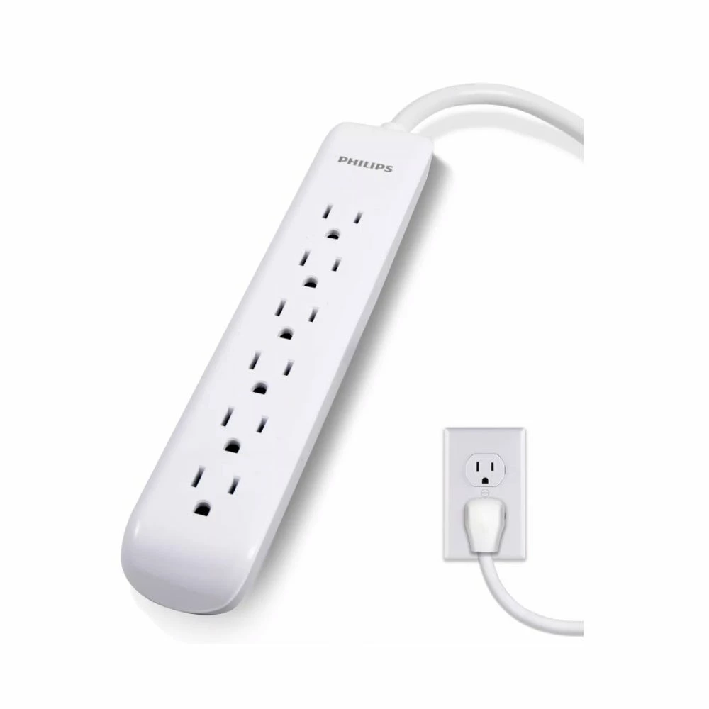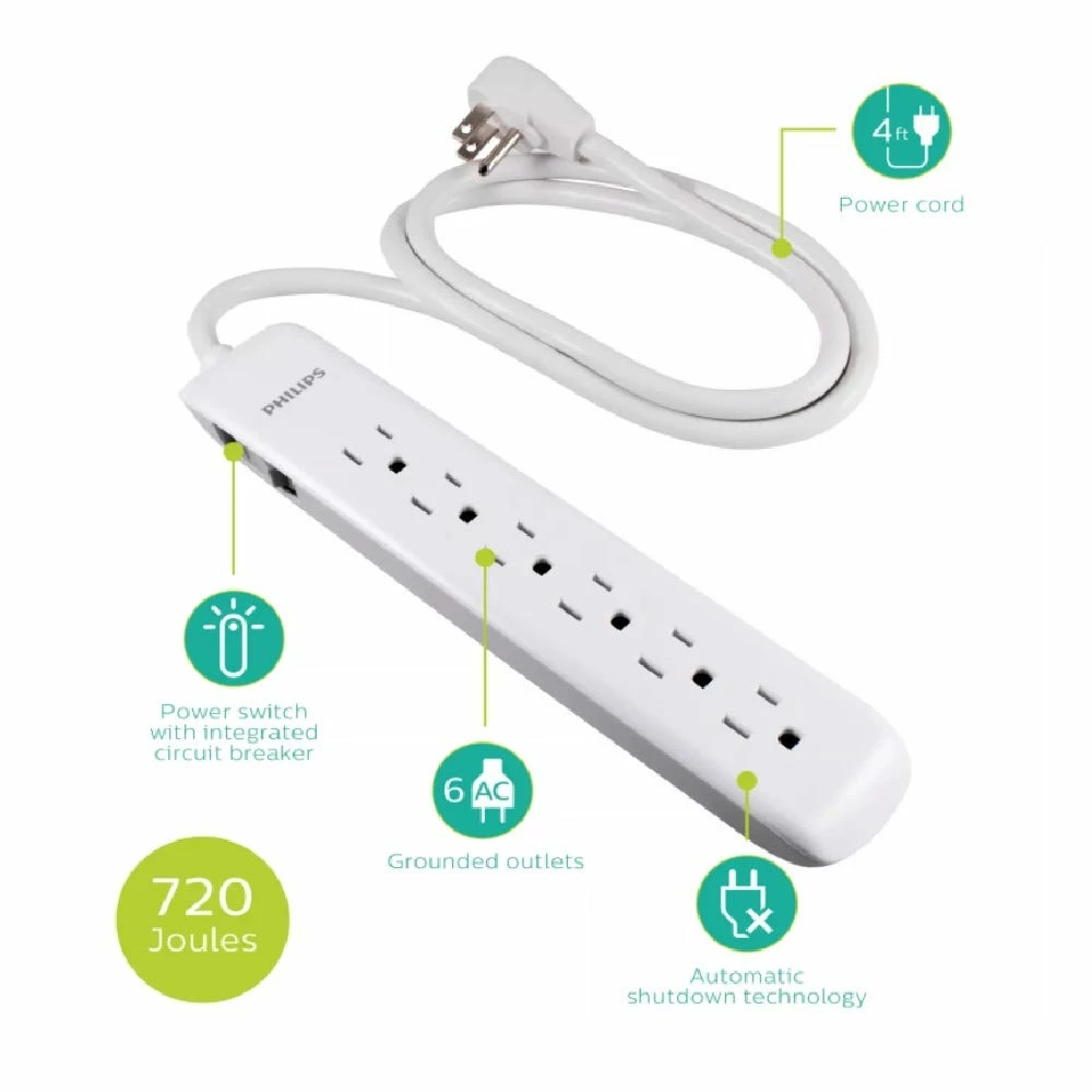 Your power does more with the Philips 6-Outlet Surge Protector. Converting one outlet into six, this powerful extension cord adds more outlets where you need them most and keeps your electronics protected from dangerous power surges. The surge protector features an integrated circuit breaker that protects your electronics if the capacity is exceeded by a power surge and automatic shutdown technology to cut power if the components expire. It also features a surge protection rating of 720 Joules to ensure your electronics are safeguarded from voltage spikes.