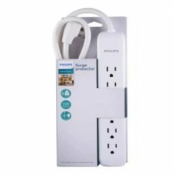 The surge protector’s extra-long 4ft. heavy-duty power cord is connected to a flat plug, allowing it to plug in easily behind desks, sofas and other furniture. Featuring a durable construction and sophisticated white finish, the power cord increases the cable’s durability and blends in with existing décor. For use in grounded (three-prong) outlets only, this product comes equipped with a $75,000 connected equipment policy and is backed by a limited-lifetime no-hassle replacement plan. Your outlet deserves an upgrade with the Philips 6-Outlet Surge Protector.Â
