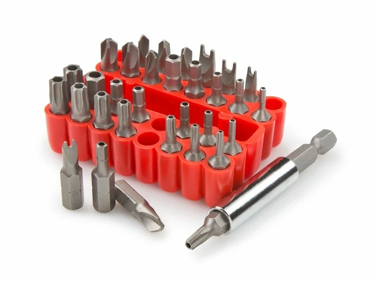 Fear No Fastener Drive five types of specialized screws in a range of sizes with the TEKTON 33-pc. Everybitâ„¢ Security Bit Set. With this set, you’ll always be ready for the unexpected tamper-resistant star, tamper-resistant hex, tri-wing, torq, and spanner fasteners that appear in certain construction applications and in cars, trucks, SUVs, and recreational vehicles. Assemble with Confidence Made from chrome molybdenum steel, these bits are precisely milled for proper fit and engagement in these unique fastener heads. Included in the set is a magnetic extension bit holder that adds reach and quickens the swapping out of bits. Organized Storage A 32-slot bit organizer neatly and efficiently stores bits and extension bit holder.