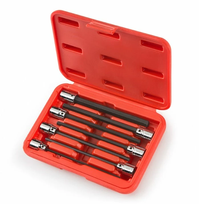 For fasteners hidden in deep recesses and tight spaces, get the TEKTON 7-pc. 3/8 in. Drive Extra Long Hex Bit Socket Set (Metric). Notched-end sockets lock onto any 3/8 in. drive ratchet, preventing them from being dropped or stuck in fastener. Premium S2 steel bits not only have the length to reach, they have the strength to free stubborn screws. Bit ends are precisely sized for an exact fit and feature chamfered edges that help bits slide into hard-to-see fasteners heads a little easier. If a bit becomes damaged or broken, simply loosening the retaining screw allows it to be removed and repaired or replaced.