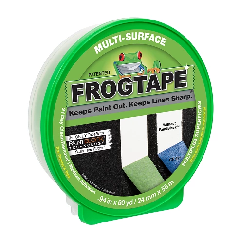 Get crisp, clean lines on your next painting project with FrogTape® Multi-Surface Painter’s Tape. How does it work? It’s made with exclusive PaintBlock® Technology, a super-absorbent polymer that reacts with the water in latex paint and instantly gels to form a micro-barrier that seals the edges of the tape to prevent paint bleed. The result is a crisp, professional paint line. Designed to work on a variety of surfaces, this professional grade painter’s tape delivers a performance you can be proud of.