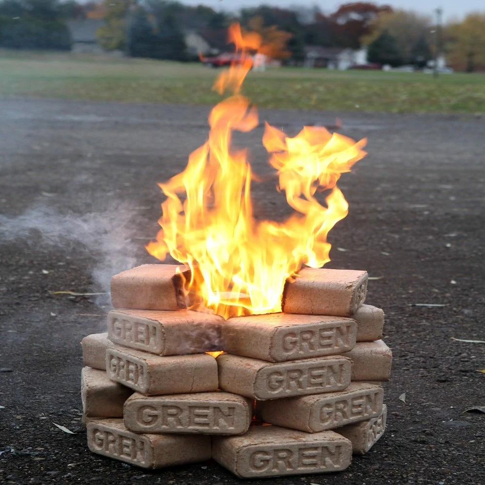 These fuel blocks are wood and may be used like firewood. they start easily if stacked with airspace between the bricks or in a “teepee” around a few wads of newspaper. Like all wood, they give off about 8600 BTU’s per pound. Since wood fuel bricks are generally dryer than cord wood, less heat is lost to the vaporization of moisture. One ton of bricks contains about 17 million BTU’s.